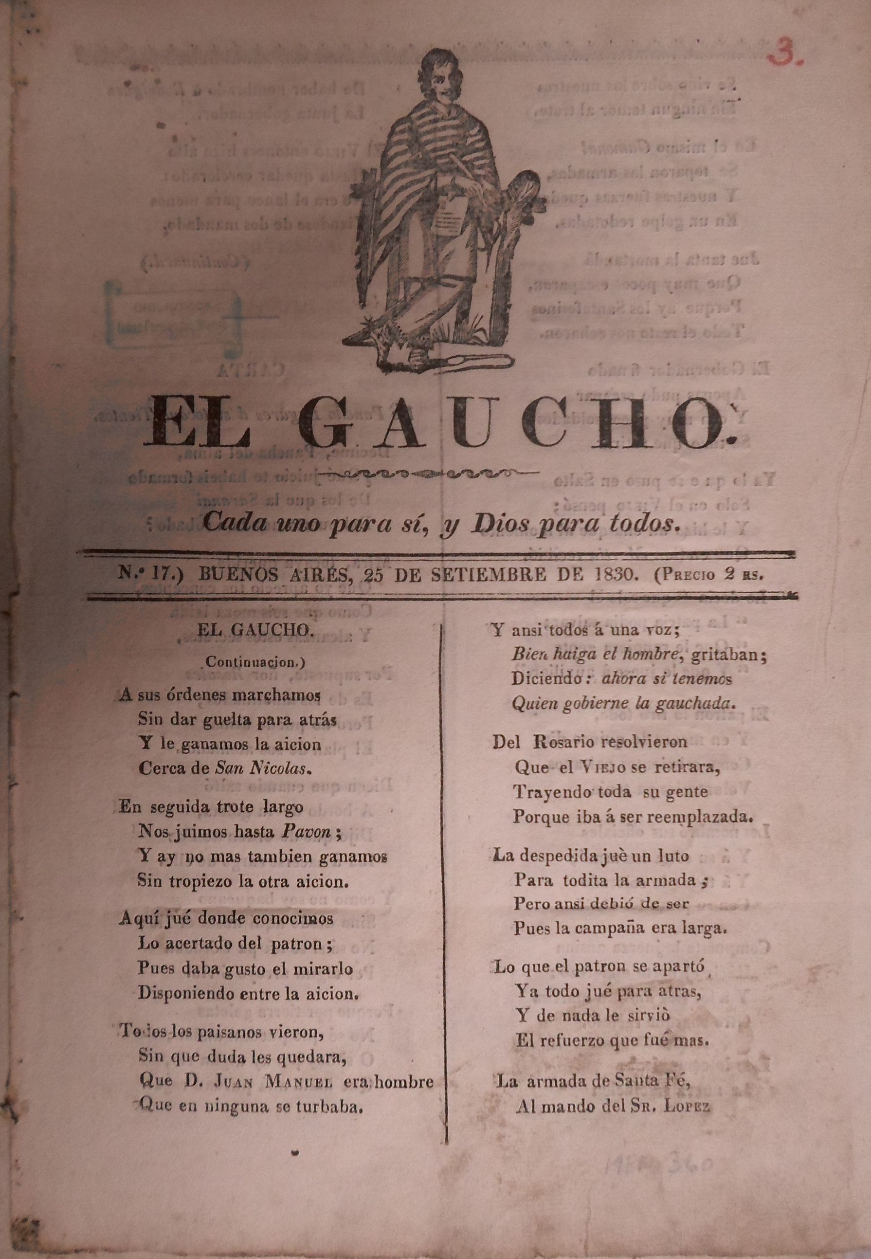 A partir de aportes de la historia de la lectura, de la bibliografía material y de los análisis sobre representación visual de Louis Marin, el artículo aborda los formatos de un conjunto de impresos publicados por el escritor gauchesco Luis Pérez entre 1830 y 1833 –más exactamente, una serie de papeles sueltos y los periódicos El Gaucho y La Gaucha–. El objetivo consiste en explorar los vínculos entre los rasgos materiales de esas publicaciones, el tipo de lector al que el autor aspiraba y el sentido y la ideología de sus textos.