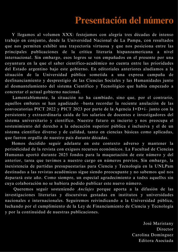 Publicación cuatrimestral del Instituto de Investigaciones Literarias y Discursivas de la Universidad Nacional de La Pampa que integra el Núcleo Básico de Revistas Científicas Argentinas. Publica trabajos de investigación originales e inéditos sobre literatura, cultura y discurso. DOI: 10.19137/anclajes