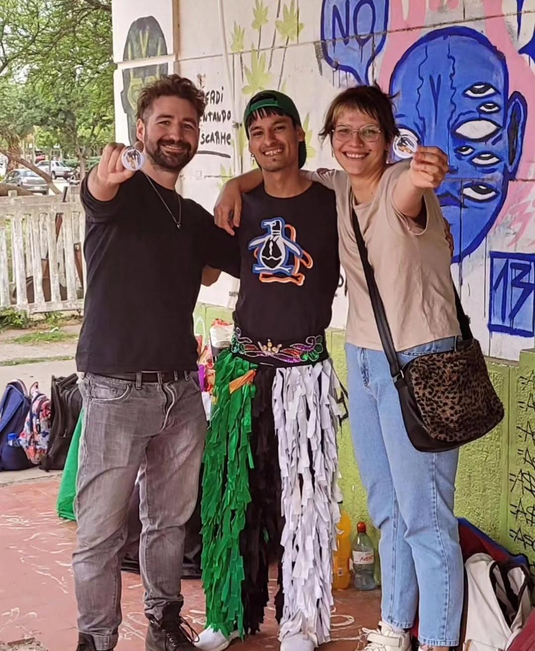 Valentina y Joaquín con Gustavo Cáseres una tarde en las vías celebrando su cumpleaños. Con la murga en el cierre de su taller en El Molino. Registro fotográfico propio durante el 2024.