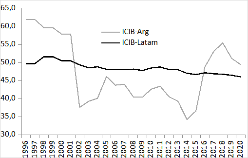La Figura 1 describe la evolución de la calidad institucional entre 1996 y 2020 para Latinoamérica y Argentina utilizando el Índice de Calidad Institucional Banco (ICIB). Con respecto a Latinoamérica (se incluyeron 21 países)[4] se observa una baja calidad institucional. En 1996 el índice tenía un valor de 49,7 mientras que en 2020 fue de 46,0 (una caída de 3,7 de punta a punta), coincidiendo con el peor año de la serie.