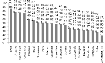 Con respecto a Latinoamérica, los países en las mejores posiciones fueron Chile (19), Uruguay (34) y Costa Rica (41). En cambio, en las peores posiciones se ubicaron Honduras (122), Paraguay (123), Ecuador (125), Haití (145) y Venezuela (146). Argentina se localizó en la ubicación 88 mientras que Brasil se ubicó en la posición 64. En ambos casos, muy lejos de países con alta calidad de las instituciones.
