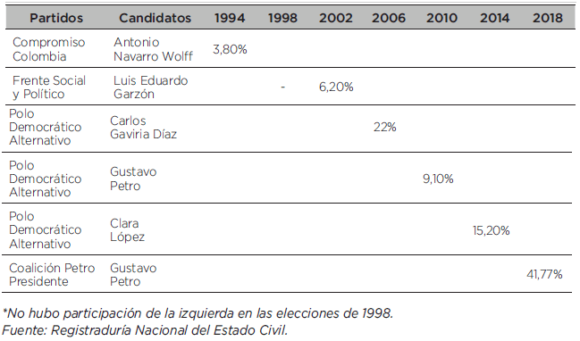 El presente artículo describe el proceso de transformación de las posturas políticas entre derecha e izquierda de los votantes colombianos desde 1974 hasta el presente. En este decurso histórico es posible establecer tres etapas de la izquierda legal colombiana: 1) entre 1974 hasta 1991; 2) entre 1991 y 2003 y 3) de 2003 hasta la actualidad. El artículo muestra estadísticamente la disminución de votantes por la derecha tradicional, el aumento de la votación por la derecha extrema hasta el aumento de la votación por la izquierda moderada, sin por ello considerar la existencia de un cambio ideológico del electorado. Se establece aquí, contrario a la teoría de Rosario Queirolo para otros países de América Latina, que Colombia no muestra una distribución ideológica “bimodal”, sino una dependencia de patrón (path dependence) según la cual ha predominado hasta el presente la ideología de derecha entre los votantes, lo que sólo empieza a romperse por la presencia electoral de un líder “untainted”.