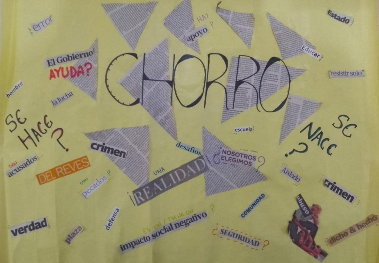 Cada uno de los collages corresponde a un grupo de estudiantes con los que se trabajó durante todo el 2024. En los talleres desarrollados durante el año lectivo, los/as estudiantes debatieron y analizaron los temas que les preocupaba e interesaba investigar. Asimismo, en el aula, desarrollaron discusiones fundamentas a partir de lecturas de textos que abordaron las problemáticas sociales que querían trabajar. Ese proceso permitió encontrar las singularidades y los puntos en común en relación con las preocupaciones de los/as jóvenes. Con sus palabras, afirmaron que la diversidad de temas tenía en común el abordar “problemas de la realidad”, es decir, aquello que les afecta en su vida cotidiana como jóvenes, estudiantes y ciudadanos/as. Así, en los talleres de producción audiovisual, en lugar de seguir la lógica de un guion preestablecido, se optó por construir en función de las multiplicidades y singularidades de las vivencias de cada sujeto.