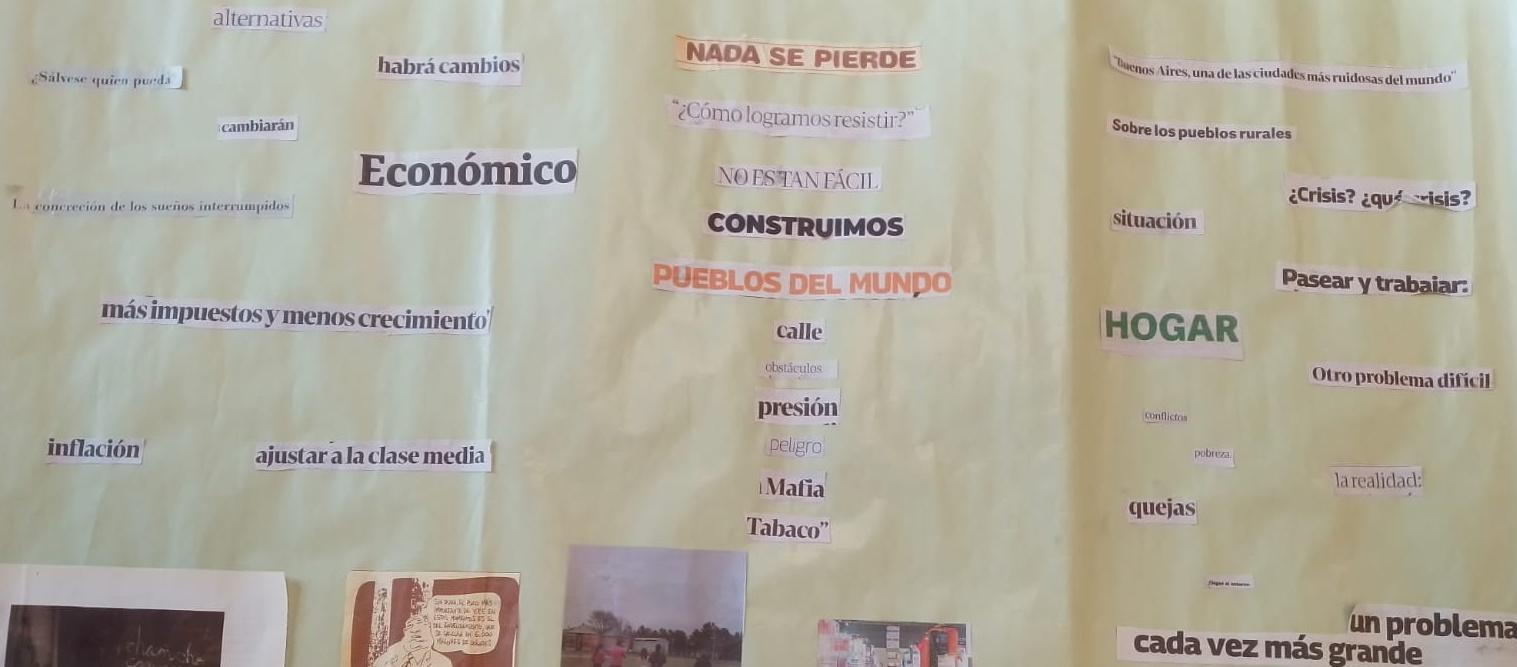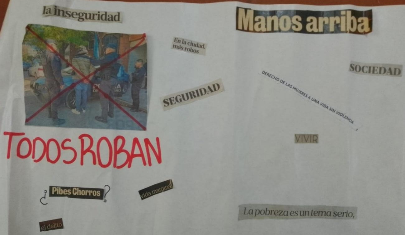 Los diversos temas que interesaba investigar a los/as estudiantes incluían dimensiones estructurales, así como situaciones individuales. En la Figura 2, 3 y 4 se observa el conjunto de temas organizados en forma de collage. Allí, se resaltan problemáticas relacionadas con la crisis económica, la búsqueda de alternativas, la seguridad e inseguridad, la pobreza, el gobierno, los robos, la inflación, los delitos, la comunidad/sociedad, entre otros.