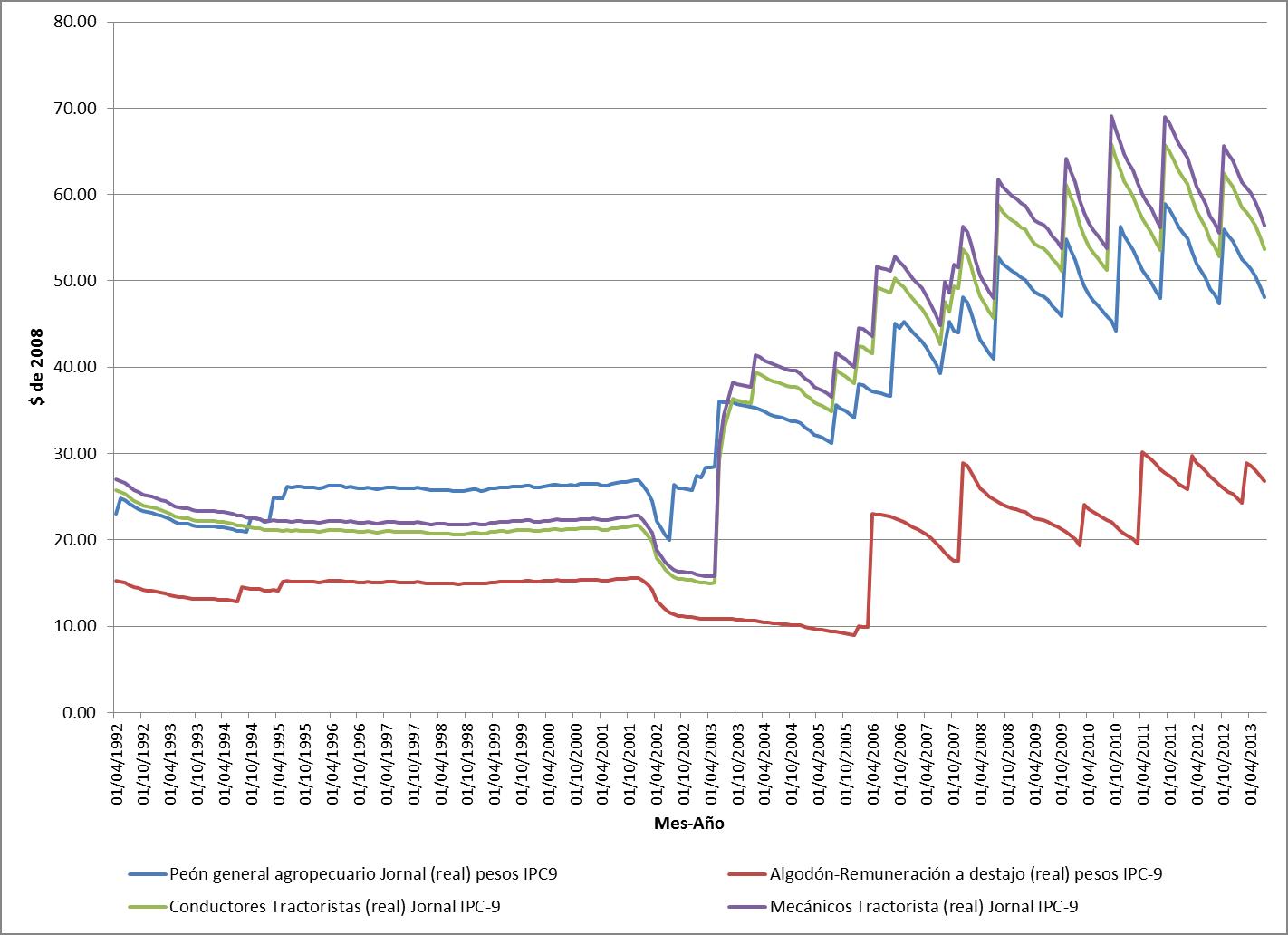 - Gráfico 1. Salarios de cosecheros manuales, de conductores tractoristas (jornales) y de peones generales (jornal) (en $ de 2008), (abril de 1992-julio de 2013) -a destajo con día típico=52 kg/día-