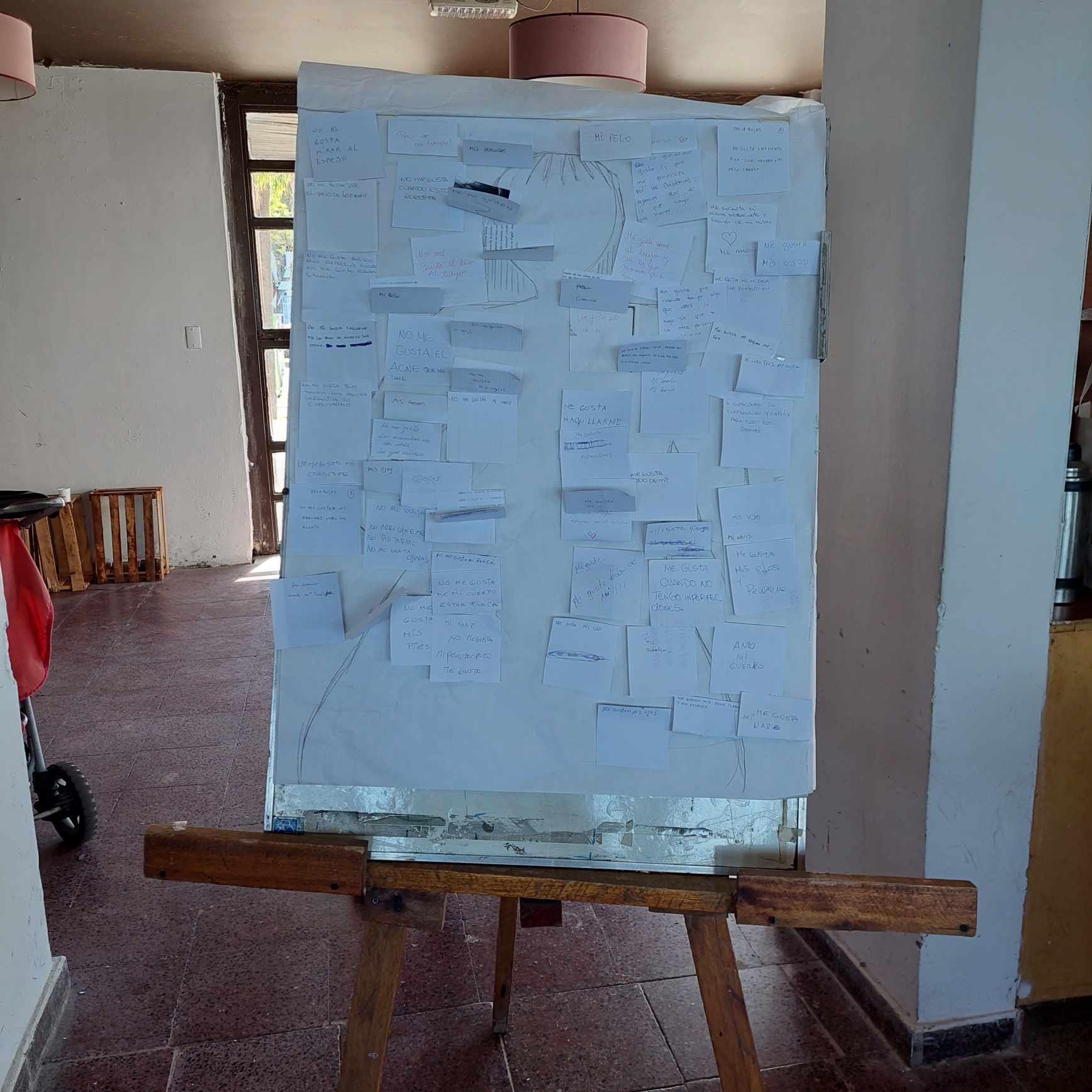 La consigna parecía sencilla e incluso frívola. Pero, a medida que circulaba el espejo se escuchaba un murmullo que fue apagándose al tiempo que se completaba la ronda. Efectuado ese primer paso, habíamos dibujado en un afiche una silueta femenina en la que cada participante iba a pegar su me gusta y no me gusta. Así, reunimos 24 pares de respuestas que en el tejido se volvieron anónimos. Entonces, quien coordinaba el taller los leyó en voz alta. De este modo, surgieron comentarios que armaron un nuevo texto sobre esas primeras y breves frases escritas.