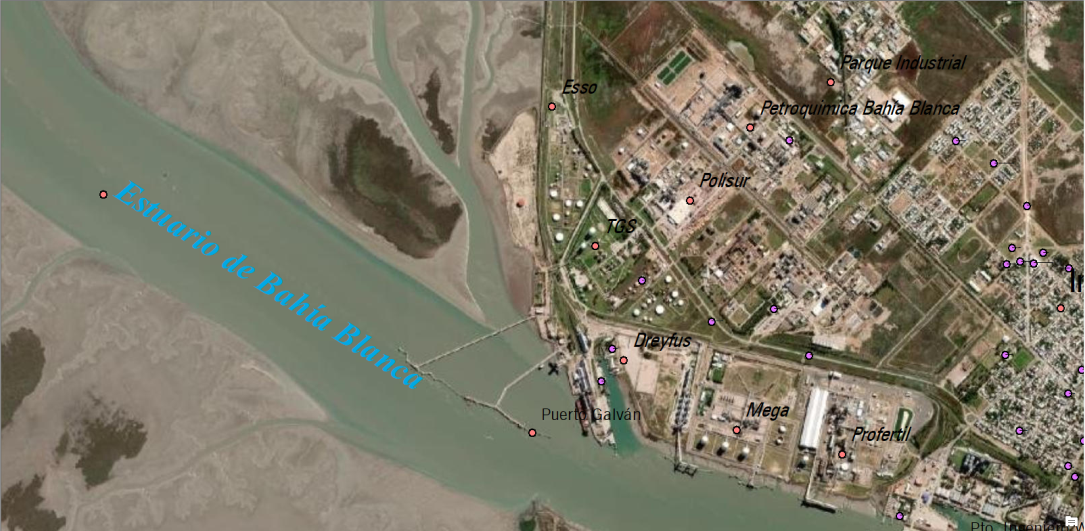 Además, se destaca la presencia de industrias en el sector de estudio. “Dow Argentina”, “UniparIndupa”, “TGS”, “Polisur”, son solo algunas de ellas. Se trata de industrias químicas o petroquímicas principalmente, que utilizan recursos naturales como gas, petróleo y sus derivados, para la elaboración de productos e insumos de diverso orden. A su vez, al tratarse de una investigación a escala 1:25.000, se incorporaron topónimos sobre escuelas, clubes, iglesias, las principales vías de circulación y centros de salud.
