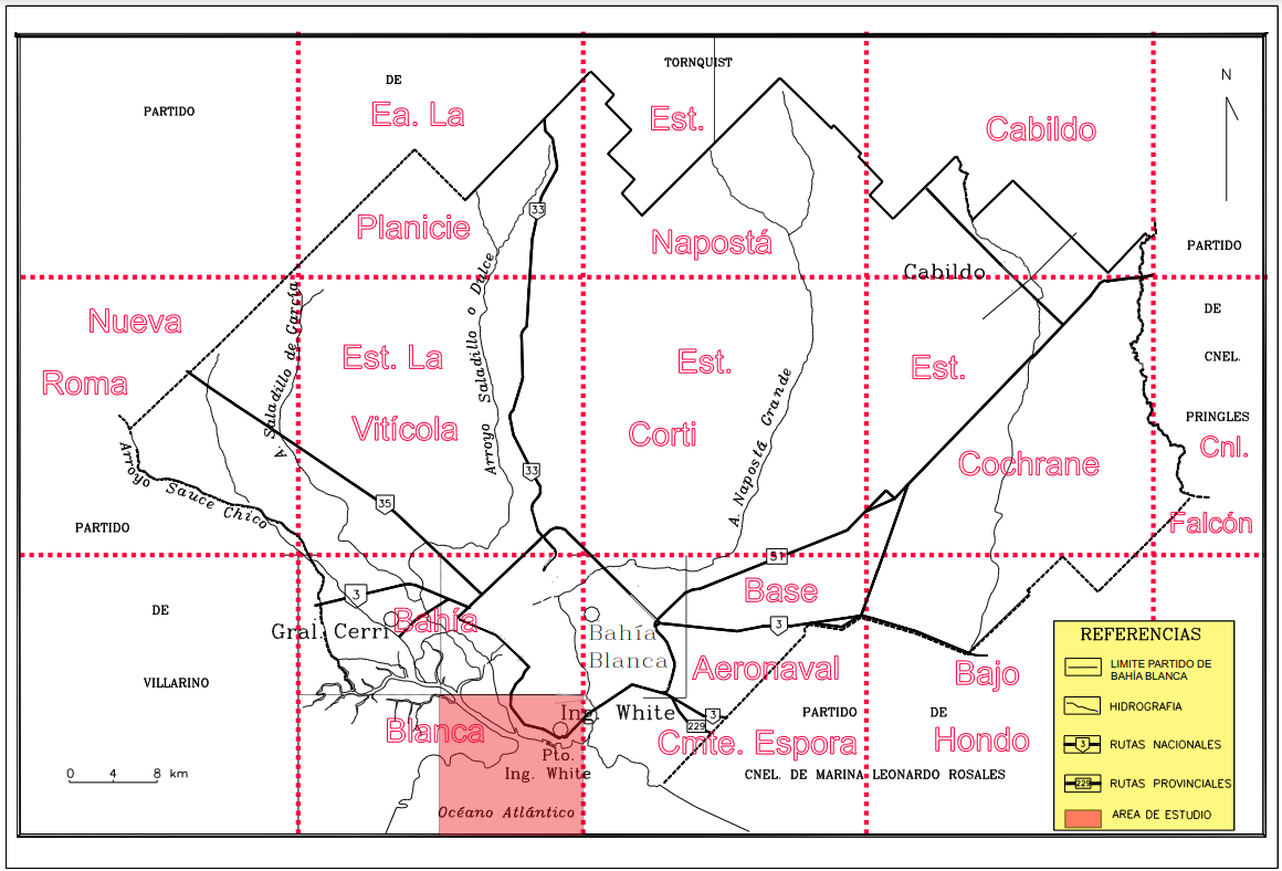 El área de estudio abarca el cuadrante inferior derecho de la carta de Bahía Blanca 3963-17-1, del I.G.N, el cual corresponde a la hoja 3963-17-1-d a escala 1:25.000, denominada como Ingeniero White (Figura Nº 1).