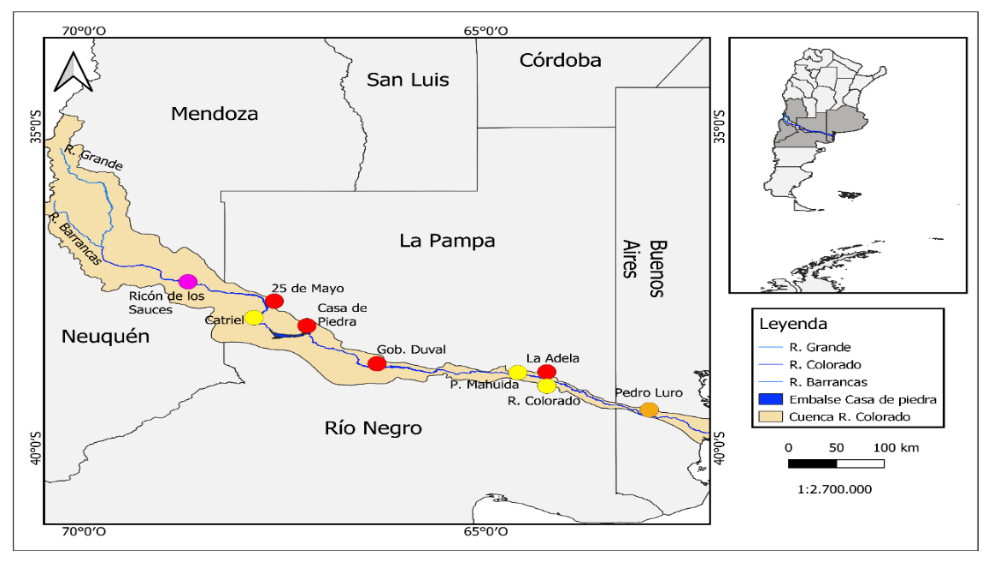 Populações altamente dependentes de recursos hídricos vivem ao longo do Rio Colorado, pois esta é uma região árida. Desde o século passado, os usos deste rio alóctone da Patagônia Norte se multiplicaram. Entretanto, o poder da polícia ambiental de La Pampa é insuficiente para controlar vazamentos industriais, de esgoto e de petróleo, dada a jurisdição do comitê interjurisdicional. A pesquisa realizada entre 2022 e 2024 teve como objetivo identificar fontes de contaminação e lacunas no monitoramento e controle, por meio de análises físico-químicas e bacteriológicas da água e estudos de comunidades de ostracodes bentônicos (bioindicadores) em sedimentos encontrados em localidades ribeirinhas. Também, por meio da observação participante, foram pesquisados mini-lixões, centros de coleta de resíduos e áreas de drenagem urbana; além de entrevistas com informantes-chave e comparação de informações oficiais. A importância do estudo reside na avaliação dos efeitos da poluição em Rincón de los Sauces e seu agravamento a jusante, utilizando uma proposta metodológica holística e multidimensional. A partir da aplicação, foram identificados problemas que desafiam a atuação do Estado, responsável final por garantir o acesso à água potável, atuar na gestão de riscos e disponibilizar informações públicas para a proteção dos recursos hídricos.