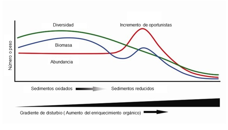 Esta tendencia continúa hasta alcanzar un máximo relativo a partir del cual, si se incrementa el enriquecimiento orgánico, tanto la biomasa como la riqueza de especies disminuyen. Si el proceso de eutrofización avanza, se intensifican las condiciones reductoras en los sedimentos y se suele observar un pico secundario de biomasa y abundancia de individuos, asociado a especies pequeñas y oportunistas, en general poliquetos (Pearson y Rosenberg, 1978). Si el enriquecimiento continúa, en el extremo del gradiente toda la fauna desaparece, y el sedimento se vuelve azoico.