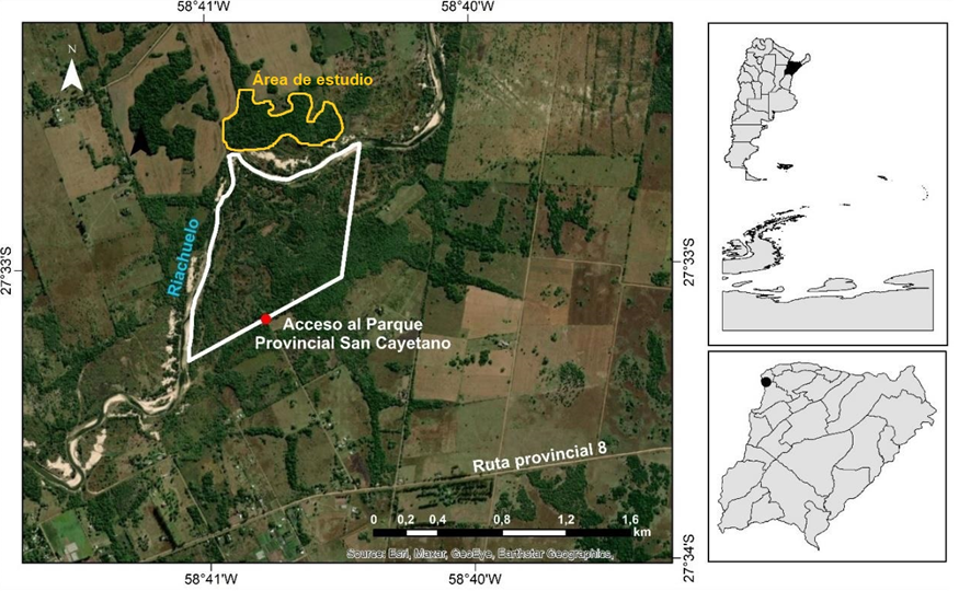 El estudio se realizó en un bosque en galería semideciduo ubicado frente al Parque Provincial San Cayetano y la Estación Biológica de Corrientes (27°30’ S, 58°41’ O), dentro de la cuenca del arroyo Riachuelo, en el noroeste de la provincia de Corrientes, Argentina. Cabe destacar que esta formación boscosa forma parte de los 24 fragmentos de bosque que albergaban grupos de monos aulladores negros y dorados (Alouatta caraya). Además, el paisaje corresponde a una terraza no inundable del arroyo Riachuelo (Contreras et al., 2022), donde coexisten bosques altos y bajos, sabanas con palmeras, pastizales y vegetación acuática vinculada a diversos cuerpos de agua (Figura N° 1).