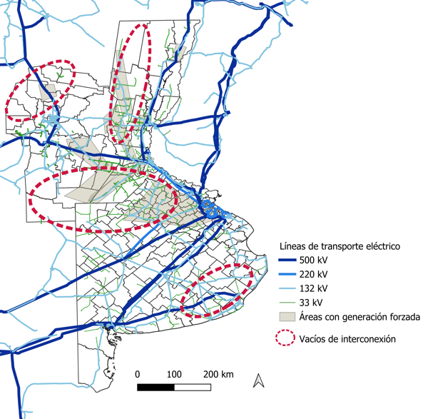 Esos espacios pueden considerarse “vacíos de interconexión”, por su conexión insuficiente o dada a partir de redes de menor voltaje. En algunos de ellos, en momentos de pico de consumo, el sistema suele recurrir a generación forzada, en base a combustibles líquidos, más costosa ambiental y económicamente (CAMMESA, 2022). Entre los vacíos de interconexión se destacan: el Noroeste bonaerense, incluyendo allí también el sur de Córdoba y de Santa Fe; la costa atlántica; y el Norte de Córdoba y Santa Fe (Figura Nº1).