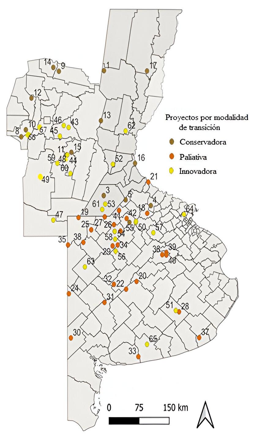 Son también numerosos (25) los proyectos identificados que se consideran de modalidad innovadora. En ambos casos, todos han sido construidos y se encuentran en funcionamiento. Son liderados por una cooperativa eléctrica como actor protagonista, en el caso de los proyectos bonaerenses de modalidad paliativa, y con apoyo en la co-construcción entre múltiples actores con participación de los usuarios y la comunidad, en el caso de los proyectos de modalidad innovadora. Éstos últimos, además, son los más recientes en el tiempo, lo que indica que esta forma de proyectos, multi-actoral y cercana al territorio, se encuentra en plena expansión.  Mientras los proyectos de modalidad innovadora incorporan cambios más profundos en el sistema energético, las tres modalidades identificadas representan hitos de avance de la transición, y contribuyen a lograr sistemas más limpios, diversificados e inclusivos.