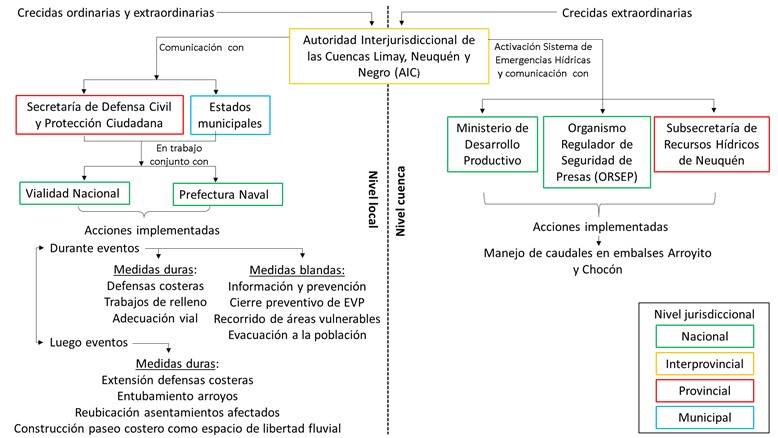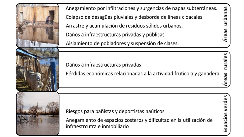 Los espacios verdes públicos (EVP) sobre las costas del río Limay en el Área Metropolitana de Neuquén (AMN) pueden representar herramientas para la gestión del agua. Para el diseño de tales instrumentos es importante conocer la dinámica local de amenazas hidormeteorológicas. El objetivo de este trabajo es analizar, desde una perspectiva histórica con base en la prensa escrita digital, la ocurrencia de eventos relacionados a amenazas hidrometeorológicas (eventos de exceso hídrico debidos a crecidas fluviales y precipitaciones intensas y/o abundantes) en el AMN y en particular, en torno a los EVP ubicados sobre la costa del río Limay para el período 1999-2020. Se relevaron 131 artículos periodísticos y la información recolectada se validó mediante bases de datos hidrometeorológicas. La metodología permitió clasificar los eventos según origen y naturaleza, así como caracterizarlos en función de sus particularidades físicas; afectaciones resultantes en áreas urbana, periurbana y rural; actores involucrados de distintas jurisdicciones y acciones efectuadas. Medidas blandas prevalecieron previo y durante eventos y medidas duras posterior a ellos. Puntualmente, las consecuencias en EVP resultan en impedimentos para sus usuarios. Los registros históricos brindan información inicial, útil e integral para el análisis de la incidencia de procesos hídricos en las ciudades.Descargas