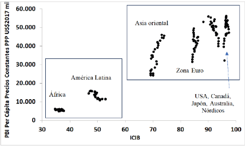 La Figura 3 describe mediante un gráfico de dispersión las relaciones entre el Índice ICIB y el PIB per cápita en dólares a PPP, para el periodo 1996-2020 para una muestra de 161 países. Se observa una relación directa entre las dos variables. En términos generales, países con “buena o alta calidad institucional” registraron ingresos por habitante más elevados con respecto a los de calidad institucional “mala o baja”. Se aprecian dos grupos de naciones. Por un lado, aquellas con índices de calidad institucional por debajo de 70 y PIB per cápita de hasta US$20.000. Por otro lado, índices por encima de 70 tienen como correlato, ingresos superiores a US$20.000 Es decir, las instituciones le impondrían un “techo” a la posibilidad de crecimiento en el largo plazo.